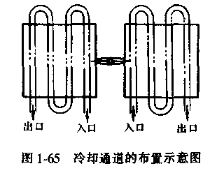 ②塑料熔體在充填型腔過程中,一船在澆口附近溫度較高,因而,應(yīng)加強(qiáng)撓口附近的冷卻,為此,冷卻水應(yīng)從撓口附近開始流向其他地方,如圖1-65所示。