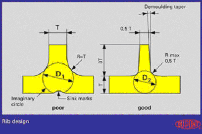 對于表面要求非常高的組件,如汽車輪蓋,的尺寸是非常重要的。正確的設(shè)計可以減少組件形成表面凹痕的可能,以提高組件的質(zhì)量。的底部的材料積聚在圖1所示的圓中。這個圓的大小與的尺寸相關(guān),應該越小越好,這樣才能減小或避免凹痕。如果圓太大,可能會形成內(nèi)部空洞,制品的機械性能將會非常差。