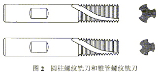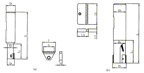 機夾螺紋銑刀適用于較大直徑(如D>25mm)的螺紋加工。其特點是刀片易于制造,價格較低,有的螺紋刀片可雙面切削,但抗沖擊性能較整體螺紋銑刀稍差。因此,該刀具常推薦用于加工鋁合金材料。圖3 所示為兩種機夾螺紋銑刀及刀片。圖3a為機夾單刃螺紋銑刀及三角雙面刀片,圖 3b為機夾雙刃螺紋銑刀及矩形雙面刀片。
