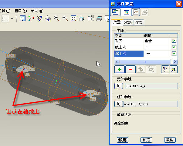 7.組建chain1,讓chain1的top與 Asm_top重合,讓軸線過第一、二基準(zhǔn)點