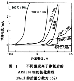 奧氏體不銹鋼離子滲氮,可有效地提高其耐磨性能,但耐蝕性卻下降。自80年代中期以來,不銹鋼離子滲氮有了重大進(jìn)展。奧氏體不銹鋼離子滲氮,可獲得不同的相組成。溫度超過500℃,可形成由γ´、ε、CrN、γ和α相組成的復(fù)合滲層,硬度高(1400HV),層厚大于200μm,從而明顯改善其耐磨、抗膠合性能,但由于滲層中有Cr的氮化物析出,導(dǎo)致基體中Cr的減少,使其耐蝕性變壞。試驗(yàn)發(fā)現(xiàn),奧氏體不銹鋼的滲層硬度、耐磨性和抗腐蝕性能隨滲氮溫度降低而增高。不同溫度離子滲氮后的陽極極化曲線(NaCI的質(zhì)量分?jǐn)?shù)為3%),如圖1所示,經(jīng)500℃×10h滲氮,即能提高腐蝕電位,而450℃滲氛時(shí),Cr的氮化物析出被抑制,而形成含有無特征的“S-相”單相層,比未處理的不銹鋼有更寬的純化電位,具有優(yōu)良的耐腐蝕性能,而且硬度高(約1600HV),可獲得同時(shí)改善耐磨和耐蝕的滲氮層,該工藝已在歐洲獲得了工業(yè)應(yīng)用。